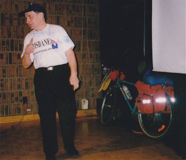 Wieczór podzieliłem na cztery bloki, w których pokazywałem wybrane slajdy z: dwóch rajdów ze Jego synami z Saskatoon na Alaskę, rajdu wokół Islandii, rajdu po wschodniej części Australii i rajdu po Patagonii. Pierwszą część komentował Jego starszy syn, Krzysztof - razem byli na trzech długich wyprawach rowerowych: dookoła Polski, po Skandynawii oraz ten w/w na Alaskę. Stwierdził on, że sukces długich wypraw rowerowych siedzi głównie w psychice każdego rowerzysty – nie tylko w jego mięśniach. Krzysztof zapamiętał szczególnie rajd wzdłuż granic Polski, ponieważ był jeszcze wtedy młodym chłopcem i było to dla niego pierwsze tego typu „rowerowe wyzwanie”.